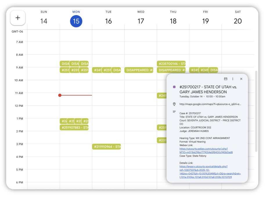 We use Utah court records to automatically populate a calendar with your upcoming court hearings, synchronized daily with the courts | We send you a weekly email listing all your upcoming Utah court hearings, with double bookings and disappearances flagged |